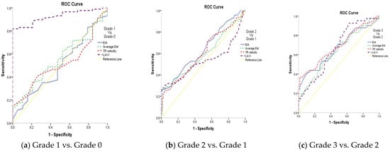 ROC curves of studied markers among grades of diastolic function are depicted in Figure 4. An AUC = 0.926 was observed with LAVI among grade 1 vs. grade 0 (0.9 is considered excellent in diagnosing patients with and without the disease) as shown in Figure 6a. The LAVI curve (purple dotted line) is above the diagonal line. Other markers had AUCs of 0.5–0.6 among the grades of the diastolic function, which suggests no discrimination in diagnosing the disease, as shown in Figure 6.