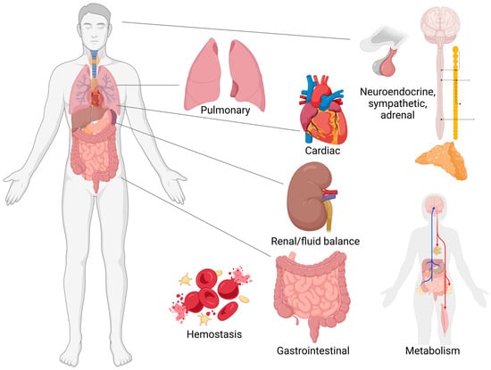 In addition to TBI-associated polytrauma and co-morbidities, TBI can also directly cause manifestations in systems outside the central nervous system. Such effects include changes in sympathetic and hormonal stress responses, impairments in organ systems, such as the cardiac, pulmonary, and renal systems, and changes in metabolism. Such TBI-induced extracranial effects are important to consider in outcomes and other pathologies that occur in the context of head trauma [7]. In addition, it can be important to consider these effects with respect to pharmacologic and other medical treatment of patients with traumatic brain injury.