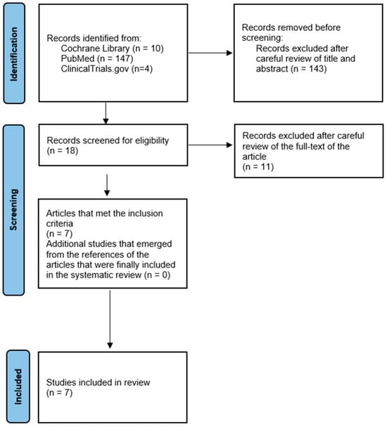 The total search yielded 161 articles, of which 143 were excluded after reviewing the title and abstract. Subsequently, 11 articles were excluded after careful examination of the full text of the article. Specifically, three articles were excluded due to lack of data [29,30,31,32]. In accordance with the exclusion criteria, an additional article was excluded on the basis that it concerned only one patient with pyoderma gangrenosum [33]. For a similar reason, three articles were excluded because they contained only two cases of patients with pyoderma gangrenosum who received adalimumab [34,35,36]. Furthermore, two articles were excluded from the review as they were provisional results of a study published in 2022 that included its final results in our systematic review [36,37,38]. Finally, the exclusion of one study was necessitated by its ongoing recruitment phase (NCT04750213), while another study (NCT03311464) corresponds to the PubMed article [38] that was included in the final review.