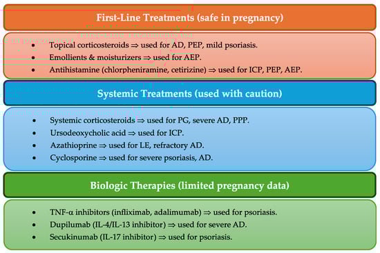 - Genovese, G.; Derlino, F.; Berti, E.; Marzano, A.V. Treatment of autoimmune bullous diseases during pregnancy and lactation: A review focusing on pemphigus and pemphigoid Gestationis. Front. Pharmacol. 2020, 11, 583354. [Google Scholar] [CrossRef]