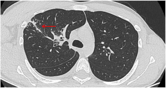A posteroanterior chest radiography (chest X-ray) before admission revealed a high-intensity opacity with indistinct margins and a heterogeneous appearance, localized in the right suprahilar region (Figure 1). Subsequent native and contrast-enhanced chest computed tomography scans (CT) identified centrilobular micronodules and consolidations associated with linear lesions that showed a characteristic “tree-in-bud” pattern in the right upper lobe, along with fluid accumulation in the right pleural cavity, suggestive of secondary pulmonary TB or other infectious ethiology (Figure 2).