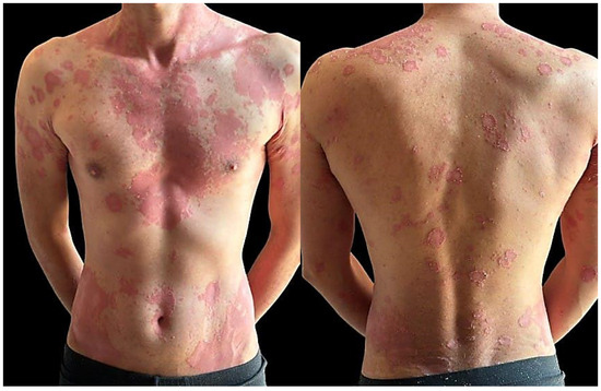 Psoriasis is a chronic, immune-mediated inflammatory skin disease that is associated with numerous comorbidities, including psoriatic arthritis, mental disorders, and cardiovascular and liver diseases. This condition affects both sexes; however, it was observed to present at an earlier age in women and individuals with a familial predisposition [3]. The age onset of psoriasis is bimodally distributed, with the incidence being highest in men aged 30–39 years and 60–69 years in women [4]. According to the World Health Organization, psoriasis was classified as a severe non-transmissible disease in 2014, also highlighting the suffering caused by misdiagnosis, inadequate treatment, and the stigma associated with this condition [5].