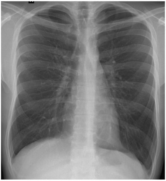 No significant abnormalities were found on admission during the general physical examination. Upon inspection, the patient exhibited a mildly affected general condition, with a normal BMI of 20.4 kg/m2 and no psoriasiform lesions or other cutaneous eruptions. Hemodynamically stable and with preserved cardiorespiratory function, the patient showed no evidence of superficial palpable lymphadenopathy. Pulmonary auscultation revealed vesicular breath sounds present bilaterally but with decreased intensity at the right lung base.