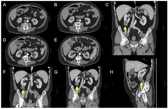 After the ultrasound findings, a computed tomography (CT) scan was performed (A–H) with and without intravenous contrast administration (iopromide 370 mg/mL). At the lower pole of the right kidney, the scan revealed a complex cystic lesion characterised by multiple thick septa and several small nodular projections (C,F,G,H), which demonstrated contrast enhancement. The lesion measured approximately 38 × 32 × 55 mm (anteroposterior, transverse, and craniocaudal diameters). These findings are consistent with a Bosniak category IV cyst. The lesion did not infiltrate vascular structures or the renal sinus. The left kidney was unremarkable. The excretory pathways were not dilated. Additional simple cortical cysts were noted bilaterally in the kidneys. No significant abnormalities were detected in other abdominal structures, except for two small hypodense lesions located subcapsularly in the liver, at the fifth and anterior fourth segments, likely cystic. The CT scan also demonstrated diffuse and concentric thickening of the rectal walls, indicative of chronic inflammatory changes and a few sub-centimetric mesorectal lymph nodes. The yellow arrow further helps to identify the renal lesion described.