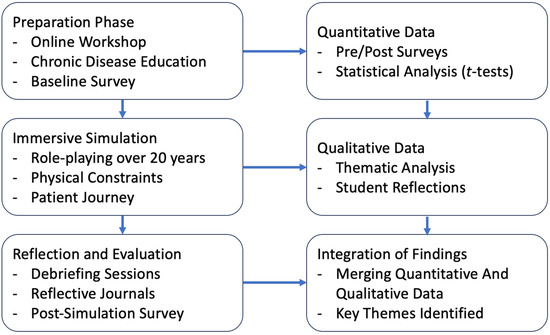 To ensure a comprehensive evaluation, both quantitative and qualitative data were collected, analysed, and integrated across study phases to assess changes in confidence, empathy, and understanding of chronic disease management (Figure 1). The preparation phase involved online workshops on chronic disease education, followed by immersive simulation, where students engaged in role-playing over a simulated 20-year disease progression. The reflection and evaluation phase included debriefing sessions, reflective journals, and post-simulation surveys. Quantitative data were collected through pre- and post-simulation surveys and analysed using statistical methods, while qualitative data were derived from thematic analysis of student reflections. Findings from both data types were integrated to assess the educational impact of the intervention, providing insights into improvements in confidence, empathy, and understanding of chronic disease management.