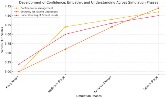 The development of confidence, empathy, and understanding across simulation phases. This figure highlights the progression of medical students’ confidence, empathy, and understanding of chronic disease management as they move through the four simulation phases. The gradual increase in scores reflects the effectiveness of the immersive learning experience, demonstrating how the exposure to simulated patient challenges enhances both clinical competence and emotional insight. The data underscore the importance of experiential learning in preparing future clinicians for long-term, patient-centred care.