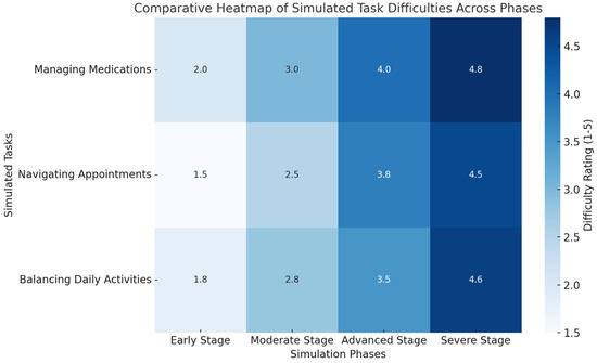 A comparative heatmap of simulated task difficulties across phases. This heatmap visualises the increasing difficulty of managing medications, navigating appointments, and balancing daily activities across the four simulation phases. Darker colours indicate greater challenges, emphasising the progressive nature of chronic disease impacts on daily life. The visualisation underscores the compounding burdens faced by patients, aligning with the experiential learning outcomes highlighted in this study.