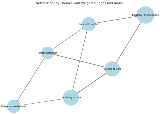 A weighted thematic network of chronic disease management: the prevalence and interconnections. This diagram illustrates the relationships between key themes identified in this study, with node sizes reflecting the prevalence of each theme in student reflections and edge thickness denoting the strength of connections between them. Larger nodes, such as “Empathy for Challenges” and “Continuity of Care”, indicate their central importance, while stronger edges highlight critical interdependencies, such as between “Barriers to Care” and “Continuity of Care”. This visualisation underscores the multifaceted and interconnected nature of managing chronic diseases effectively.