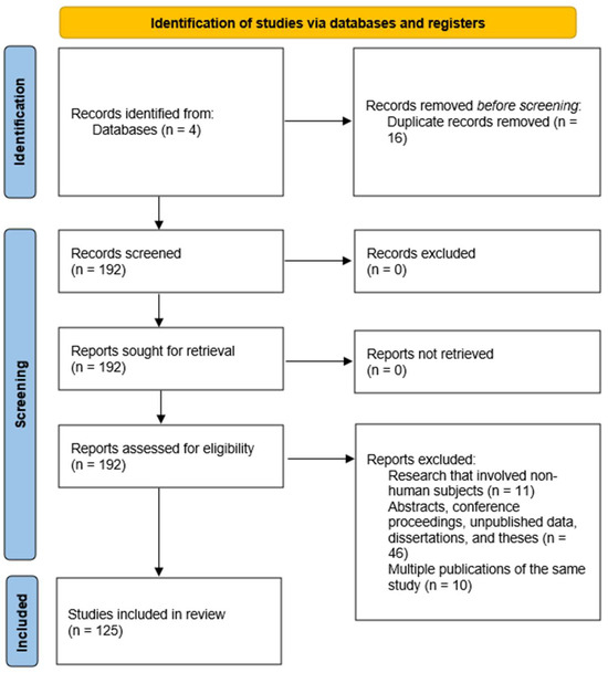 PRISMA flow chart outlining the process of identifying, screening, and including studies for this review on oral microbiota. From the 4 databases studied, 192 articles entered the screening process, of which 125 met the study eligibility criteria.