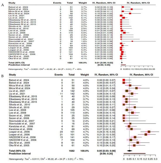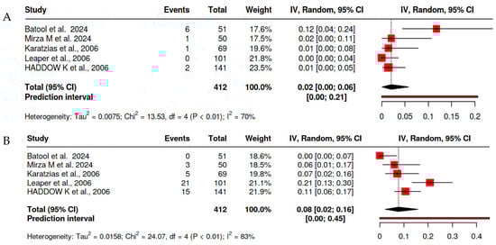 Forest plot of the prevalence of hemorrhage after bipolar tonsillectomy [14,18,19,22,23] (A) for primary hemorrhage and (B) for secondary hemorrhage.