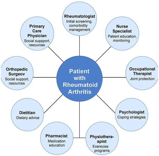 - Gukova, X.; Hazlewood, G.S.; Arbillaga, H.; MacMullan, P.; Zimmermann, G.L.; Barnabe, C.; Barber, C.E. Development of an Interdisciplinary Early Rheumatoid Arthritis Care Pathway. BMC Rheumatol. 2022, 6, 35. [Google Scholar] [CrossRef]