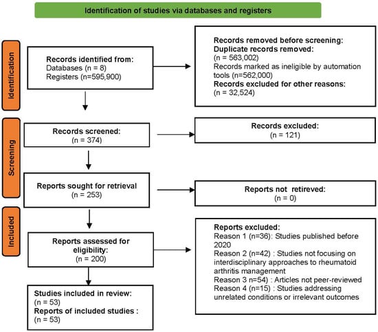 - Inchingolo, F.; Inchingolo, A.M.; Fatone, M.C.; Avantario, P.; Del Vecchio, G.; Pezzolla, C.; Mancini, A.; Galante, E.; Palermo, A.; Inchingolo, A.D.; et al. Management of Rheumatoid Arthritis in Primary Care: A Scoping Review. Int. J. Environ. Res. Public Health 2024, 21, 662. [Google Scholar] [CrossRef] [PubMed]