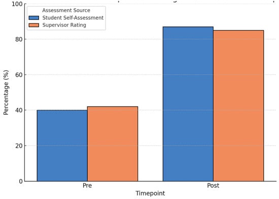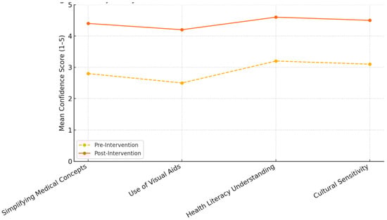 The results after the intervention indicated improved outcomes for all aspects of the students (Figure 1). The average confidence in simplifying medical concepts improved to 4.4 ± 0.5, in using visual aids and teach-back to 4.2 ± 0.6 (each p < 0.01), and in applying health literacy concepts to 4.6 ± 0.3 (p < 0.001). Cultural sensitivity also improved, with 87% of the students feeling more confident in cross-cultural communication. The supervisor ratings of 85% of the students stated they were “competent” or “highly competent” after the intervention (Table 2). The students identifying education as essential increased to 92% (from 54%) and confidence in managing patient expectations increased to 81% (from 37%).