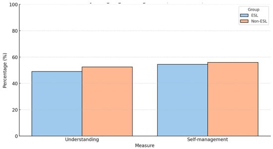 Improvement in patient understanding and self-management by language background (pre- and post-intervention). This figure illustrates the percentage of patients reporting adequate understanding of their health condition and confidence in self-management before and after participation in the CBE intervention. Data are stratified by language background: patients with English as a second language (ESL) and those with English as their first language (Non-ESL). ESL patients showed greater relative improvements in both domains, particularly in health understanding (22% to 76%), compared to Non-ESL patients (34% to 71%). These findings highlight the intervention’s potential to address disparities in health literacy among linguistically diverse populations.
