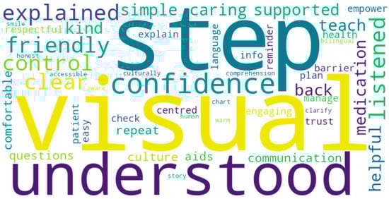 Common themes in patient feedback from education sessions. This word cloud highlights frequently mentioned words and phrases in patients’ free-text responses following the CBE intervention. Key themes include “confidence”, “understood”, “explained”, “friendly”, “trust”, and “clear”, suggesting that the sessions improved comprehension, comfort, and patient engagement. Terms such as “culturally aware”, “visual aids”, and “teach-back” indicate the perceived usefulness of interactive, inclusive communication strategies. The prominence of emotionally positive descriptors underscores the value patients placed on being listened to and respected.