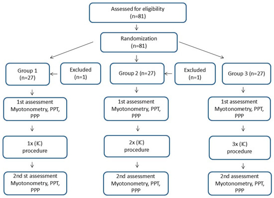 In each of the 3 study groups, before the execution of the therapeutic procedure (IC), the following were conducted, in sequence: myotonometric measurement and PPT together with the assessment of PPP, in order to examine the biomechanical properties of muscle fibers in the MTrP area, pain threshold, and intensification of pain. Subsequently, the IC procedure was performed in respective groups, in accordance with the following protocol:
