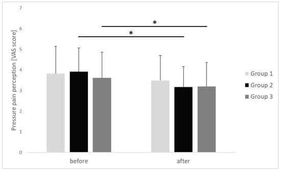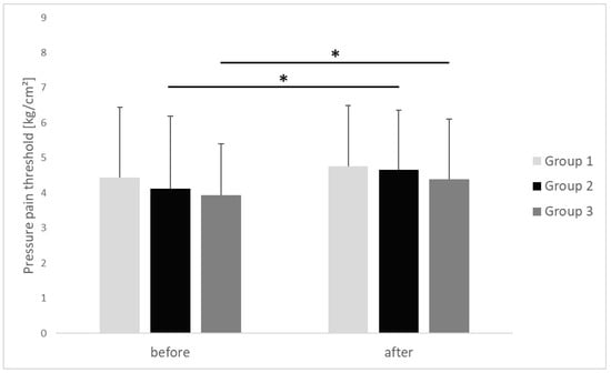 Changes of pressure pain threshold of the upper trapezius trigger points (mean value ± SD) before and after ischemic compression in particular groups. p value of <0.05 is represented as *.