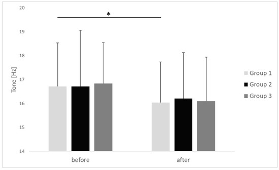 The statistical analysis of the collected data was performed using the Statistica 13 package (Statsoft, Kraków, Poland). The Shapiro–Wilk test was used to test the normality of data. The results are presented as mean values and standard deviation. The Wilcoxon test was used to test the statistical significance of the differences in the examined parameters, before and after the treatment applied (for two matched samples). The statistical significance of differences between the unmatched data (groups) was tested using the Kruskall–Wallis test. The level of statistical significance was set at p < 0.05. The effect size (r for Wilcoxon test) was calculated, with r = 0.1 indicating a small effect, r = 0.3 indicating a medium effect, and r = 0.5 indicating a large effect. The effect size (η2 for Kruskall–Wallis test) was also calculated, with η2 = 0.01 indicating a small effect, η2 = 0.06 indicating a medium effect, and η2 = 0.14 indicating a large effect. G*power software (version 3.1.9.7; Heinrich—Heine—Universität Düsseldorf, Düsseldorf, Germany; (http://www.gpower.hhu.de, accessed on 25 February 2025) [28] was used to determine the power using 2-sided testing, α = 0.05, with the sample size = 79. The result used for power analysis was tone [Hz]. The effect size was 0.38. The power (1-β err prob) was calculated as 0.91. The test family was “t-test”, and the statistical test was the Wilcoxon signed-rank test (marched pairs). The type of power analysis was “Post hoc: Compute achieved power—given α, sample size, and effect size”.