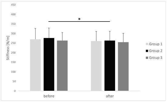 In group 2, the average value of stiffness in upper trapezius MTrPs decreased with statistical significance and medium effect size, from 276.46 ± 52.43 N/m before the start of IC to 263.15 ± 48.49 N/m after completion of the procedure (p = 0.036, r = 0.41). In groups 1 and 3, the stiffness in upper trapezius MTrPs after completion of the IC procedure showed a decreasing trend; however, the differences in comparison with initial values from before the beginning of the procedure turned out to have no statistical significance (p > 0.05). There were no inter-group differences in stiffness of the upper trapezius MTrPs before (p = 0.924, η2 = 0.01) and after (p = 0.821, η2 = 0.02) the applied procedure (Figure 5). The observed effect sizes were small.