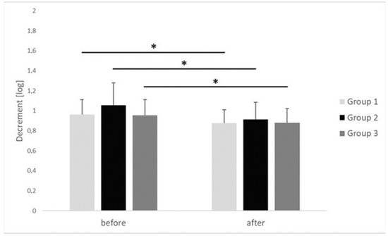 In the case of all groups, the decrement value, which conversely described flexibility, decreased statistically significantly after the IC procedure was performed, in comparison with the initial values measured before the procedure started. In group 1, the average value of decrement after the IC procedure had been performed turned out to decrease, from 0.96 ± 0.15 log to 0.87 ± 0.13 log (p = 0.022, r = 0.61). In group 2, the average value of decrement after the IC procedure had been performed decreased from 1.05 ± 0.22 log to 0.91 ± 0.17 log (p = 0.001, r = 0.64). We observed large-size effect in group 1 and in group 2. In group 3, in turn, the average value of decrement after the IC procedure had been performed decreased from 0.95 ± 0.15 log to 0.88 ± 0.14 log (p = 0.042, r = 0.38). There were no inter-group differences in decrement of the upper trapezius MTrPs before (p = 0.882, η2 = 0.02) or after (p = 0.709, η2 = 0.01) the applied procedure (Figure 6). The observed effect sizes were small.