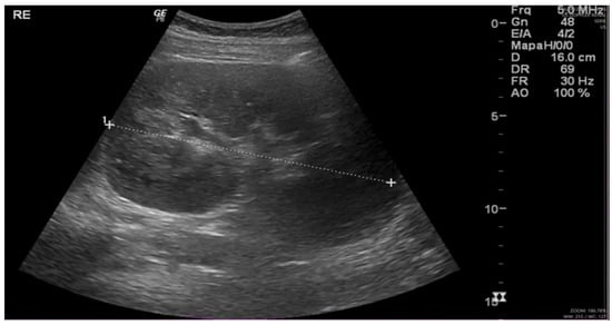Following nearly three weeks of treatment with ceftriaxone, the patient exhibited partial recovery of kidney function, with creatinine decreasing from 4.43 to 1.81 mg/dL (Table 1). A follow-up ultrasound was performed, revealing an increase in kidney size (Figure 1) compared to the initial examination. Bladder presented with good filling, regular walls, and anechoic content. These findings were confirmed by abdominal computed tomography (CT), which demonstrated bilateral nephromegaly (Figure 2).