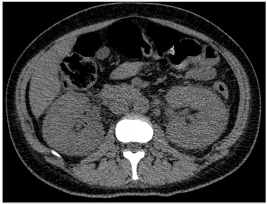 Renal involvement in malakoplakia is often bilateral and can result in AKI [,,]. The disease predominantly affects adults over the age of 40 years and is two [] to four [] times more common in women. Escherichia coli is the most common pathogen [,,], as also shown in Table 2. Clinical features are nonspecific and may include fever, flank or lumbar pain, and palpable masses [,,,], which were also found in the present case.
