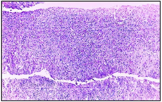 The term malacoplakia derives from the Greek words malakos (soft) and plakos (plaque). Malacoplakia is a rare, chronic granulomatous disease, a multisystemic condition most commonly affecting the urogenital tract in immunocompromised individuals. However, it can affect multiple organs, including the gastrointestinal tract, lungs, bones, lymph nodes, and skin. The urinary tract is involved in nearly 60% of cases, with the bladder affected in 40%, the ureters in 11%, and the renal pelvis in 10% of the cases []. Its pathophysiology involves defective lysosomal degradation in macrophages, resulting in cytoplasmic accumulation of bacterial debris and the formation of Michaelis–Gutmann bodies and Von Hansemann cells [,,,,]. Malacoplakia is frequently associated with persistent Gram-negative bacterial infections, particularly Escherichia coli [,,,].