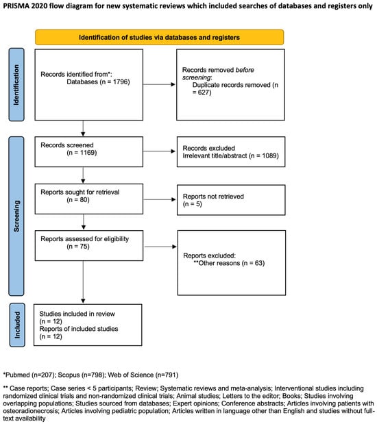 Of the 1796 articles identified in the databases, 12 studies were ultimately included in the quantitative analysis [13,14,15,16,17,18,19,20,21,22,23,24] after removing duplicates, screening titles and abstracts, and assessing full texts against our inclusion criteria. The PRISMA flow chart illustrating the selection process is presented in Figure 1. Table 2 summarizes their descriptive characteristics. The included studies were published between 2009 and 2025 and conducted between 2004 and 2024. Ten studies were cohort designs [13,14,16,17,18,19,20,21,23,24], while two were case series [15,22]. A total of 171 patients with MRONJ were included, all of whom underwent reconstruction with free flaps. Gender data were available in all 12 studies [13,14,15,16,17,18,19,20,21,22,23,24], with males comprising 32.1% of patients. Mean age was reported in 11 studies [13,14,15,16,17,18,20,21,22,23,24], with a median value of 64.7 years.