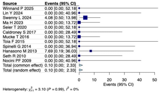 A random-effects model analysis estimated the prevalence of free flap failure in MRONJ patients undergoing reconstruction at 0.1% (95% CI: 0–2.3%), with not important heterogeneity between studies (I2 = 0%) (Figure 2). Leave-one-out analysis showed consistent results, with no single study markedly affecting the pooled estimate (Supplementary Figure S1).
