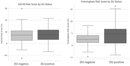 Notably, metabolic parameters, including total cholesterol, HDL, LDL, triglycerides, fasting glucose, insulin, and calculated indices such as the TyG index, HOMA-IR, LDL/HDL ratio, TG/HDL ratio, and Atherogenic Index of Plasma (AIP), showed no significant differences between groups. Similarly, inflammatory and cardiac biomarkers (CRP, hs-TnT, NT-proBNP, and uric acid) were comparable. Blood pressure and heart rate, measured twice five minutes apart, did not differ significantly. Moreover, Framingham risk scores were higher in DU-positive patients (p = 0.048), indicating an increased cardiovascular risk, whereas ASCVD risk scores were similar, as shown in Figure 1.
