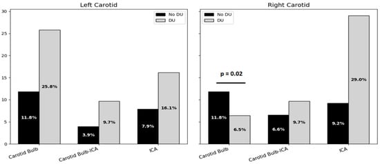 On the left side, plaque prevalence in the carotid bulb was 11.8% in the non-DUs group and 25.8% in the DUs group, without reaching statistical significance. Plaques at the bulb–ICA transition were detected in 3.9% of non-DU and 9.7% of DU patients, while isolated ICA plaques were found in 7.9% and 16.1% of patients. In contrast, the right side revealed that carotid bulb plaques were significantly more frequent in patients with a history of DUs compared to those without (29.0% vs. 11.8%, p = 0.02). Plaques at the bulb–ICA site were seen in 9.7% of DU patients and 6.6% of non-DU patients (p = 0.69), and ICA plaques were seen in 29.0% vs. 9.2%, respectively (p = 0.07), showing a trend toward significance (Figure 3).