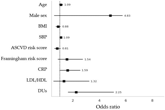 Secondly, in the binary logistic regression model employing plaques at any site as a dependent variable, it was revealed that both SBP and DUs were significantly associated with plaque presence (adjusted OR 1.09, p = 0.019; adjusted OR 2.25, p = 0.015, respectively) (Figure 4). Other included variables were age, sex, BMI, Framingham and ASCVD risk scores, and LDL/HDL ratio, which failed to prove associations.
