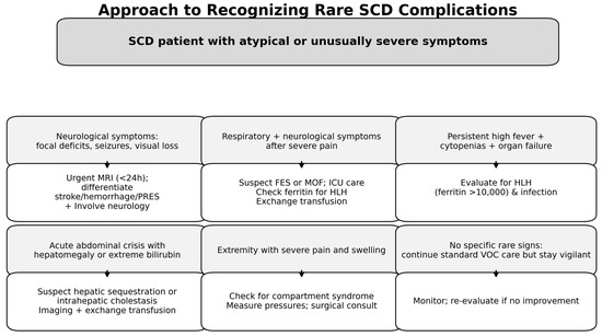 - Structured differential diagnosis: Develop and utilize differential diagnosis frameworks that explicitly include rare SCD complications alongside common ones based on symptom clusters. The emergency department represents a critical juncture where atypical presentations must be promptly recognized [53];