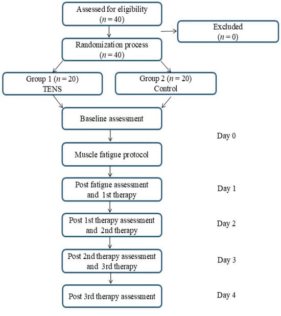 This prospective clinical trial included forty healthy volunteers who were randomly assigned to one of two groups using simple 1:1 randomization generated via the Randomizer.org website. Group 1 received transcutaneous electrical nerve stimulation (TENS; n = 20; 9 men and 11 women), while Group 2 served as the control group (n = 20; 9 men and 11 women). The experimental protocol was structured as follows: Day 0—baseline assessment using a myotonometer and a pain intensity scale, followed by the administration of a muscle fatigue protocol; Day 1—post-fatigue assessment with the myotonometer and pain evaluation prior to the first therapeutic intervention, which was then performed; Days 2 and 3—myotonometric and pain assessments were conducted prior to therapeutic intervention, which followed the procedures applied on the previous day; Day 4—final measurements of muscle mechanical properties and pain intensity. In total, each participant underwent three therapeutic interventions (Days 1–3), five myotonometric assessments, and five pain intensity evaluations (Days 0–4) (see Figure 1). A 24 h recovery period was maintained between consecutive interventions and measurements to ensure adequate rest. All procedures were conducted between 09:00 and 14:00, with strict adherence to participant scheduling. Before inclusion in the study, all participants provided written informed consent. The testing environment was controlled and consistent throughout the study, with ambient temperature maintained at 22 °C and relative humidity at 50%.