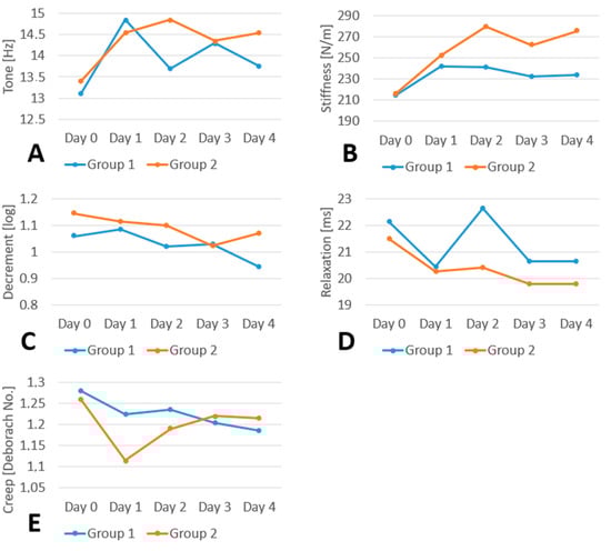 Graphical representation of changes in the biomechanical properties of the gastrocnemius muscle in both study groups from Day 1 to Day 4: (A) tone, (B) stiffness, (C) logarithmic decrement, (D) mechanical stress relaxation time, and (E) creep (Deborah number).