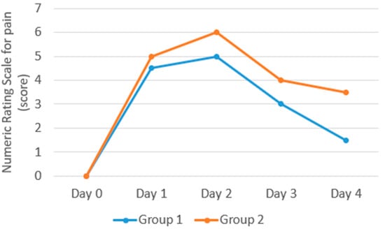 Statistically significant changes in pain intensity were observed in Group 1 (p < 0.001) and Group 2 (p < 0.001). Post hoc multiple comparisons (Dunn–Bonferroni) revealed statistically significant intensification of pain for (Day 0 vs. Day 2), both in Group 1 (p < 0.001) and in Group 2 (p < 0.001). From Day 2 on, pain turned out to decrease statistically significantly only in Group 1 in the case of (Day 2 vs. Day 4; p < 0.001). At the end of observation (Day 4), a statistically significant (p = 0.006) decrease in pain intensity was observed in Group 1 (Table 2 and Figure 3).