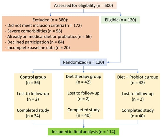 Patients with severe chronic diseases, such as renal or hepatic insufficiency, active neoplasms, or chronic gastrointestinal disorders, were excluded to minimize confounding variables that could obscure intervention effects. Although MS is associated with an increased risk of these severe conditions, the study aimed to evaluate dietary and probiotic interventions in a population with modifiable metabolic dysfunction, rather than those with advanced disease states requiring specialized medical management. Additionally, individuals on medications affecting neurotransmitter levels, pregnant or lactating women, and those unwilling to participate were excluded (Figure 2).