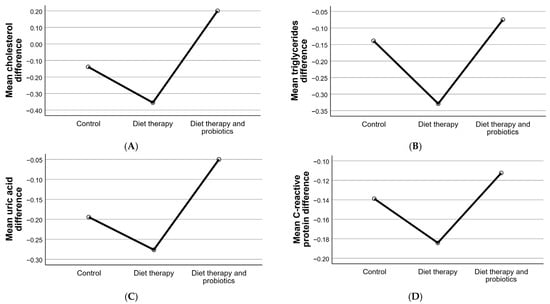 The inclusion of probiotics in the dietary intervention yielded more variable results. While probiotics are well documented for their ability to positively modulate the gut microbiota, reduce inflammation, and improve metabolic regulation [46,47], their effects in this study were less pronounced in terms of cholesterol and triglycerides. Interestingly, cholesterol levels in the probiotics group showed a slight increase, potentially reflecting individual variability in metabolic responses or specific interactions between probiotics and dietary components. Despite this, reductions in triglycerides and CRP suggest a moderate anti-inflammatory effect of probiotics, underscoring their potential role in systemic inflammation management.