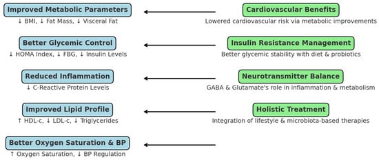 Dietary interventions, particularly when combined with probiotics, have shown promising results in reducing systemic inflammation and enhancing metabolic function [26]. Probiotics modulate the gut microbiota, which in turn regulates the production of metabolites and neurotransmitters such as GABA and glutamate, crucial for maintaining systemic homeostasis [27].