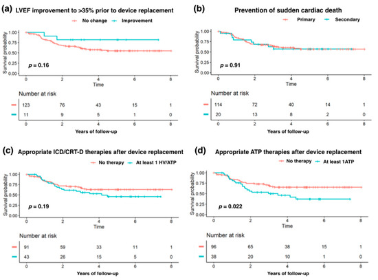 Kaplan–Meier estimates of the long-term risk of all-cause death depending on (a) LVEF improvement to >35% prior to device replacement, (b) the primary or secondary prevention of sudden cardiac death, (c) any appropriate therapies after device replacement, or (d) appropriate ATP therapies after replacement. Abbreviations: ATP—antitachycardia pacing; HV—device shock therapy; LVEF—left ventricular ejection fraction. The between-group comparisons were performed with the use of the log-rank tests.