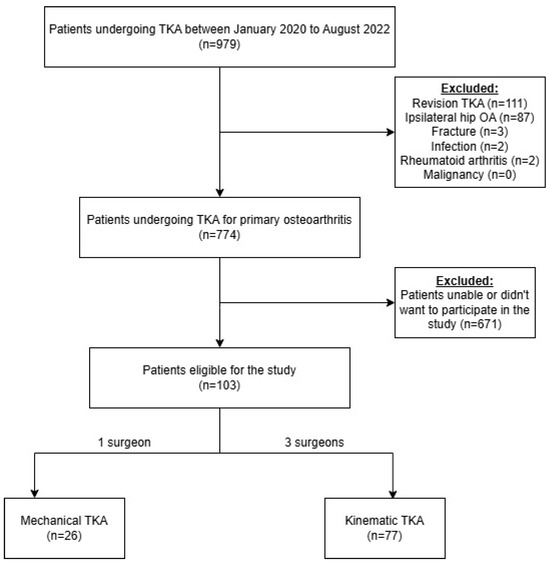 This prospective cohort study, conducted at a tertiary care institution, included all patients who underwent TKA using either MA or KA techniques between January 2020 and August 2022. Inclusion criteria consisted of patients classified as Kellgren–Lawrence grade 3 or 4 [16], who had failed non-operative management, including structured physiotherapy and intra-articular corticosteroid injections. Exclusion criteria were revision surgeries, concomitant ipsilateral symptomatic hip osteoarthritis, TKA due to fracture, infection, rheumatoid arthritis, and malignancy (Figure 1). Eligible patients were asked to provide informed consent to participate in the study. Patients were scheduled for surgery either to a single surgeon performing MA TKA or to one of three surgeons performing KA TKA (Figure 1). All surgeons were high-volume practitioners (>100 procedures per year), each with over 10 years of experience. Patients were followed during hospitalization and at 14 days postoperatively (POD 14) for several outcomes: (1) patient-reported outcome measures (PROMs); (2) functional performance; (3) pain relief and analgesic use; (4) length of hospitalization; and (5) discharge disposition. The study protocol received approval from the local institutional review board.