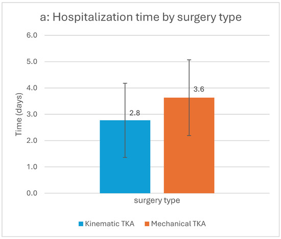 Patients in the KA TKA group had shorter hospitalization time (a), showed faster times in TUG test (b) and were more likely to be discharged home compared to MA TKA patients (c). The two-sided bars in Figure 2a,b represent the 95% confidence intervals. p-value < 0.05 for all three univariable analyses.