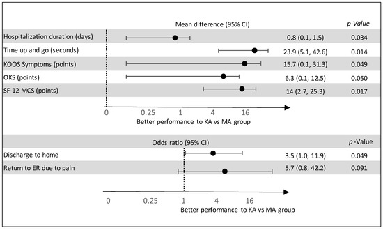 In terms of functional performance, the TUG test on POD 1 showed statistically significant favorable results in the KA group compared to the MA group (28.2 ± 26.8 vs. 47.6 ± 42.6 s, p = 0.023) (Figure 2). Findings persisted in multivariable analysis, where the KA TKA group demonstrated statistically significant better outcomes for POD 1 TUG (MD = 23.9, 95% CI 5.1 to 42.6) and hospitalization duration (MD 0.76, 95% CI −1.47 to −0.06, indicating shorter hospitalization for the KA group. Furthermore, patients in the KA TKA group were approximately 3.5 times more likely to be discharged home, rather to a rehabilitation facility, compared to the MA TKA group (OR = 3.5, 95% CI 1.01–11.96) (Figure 3).