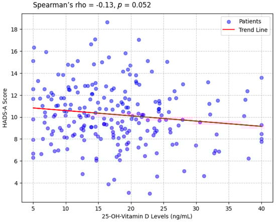 A weak negative correlation was observed between 25-OH-vitamin D levels and HADS-A scores (Spearman’s rho = −0.17, p = 0.052), indicating that lower vitamin D levels were associated with higher anxiety (Figure 1). A similar correlation was found with HADS-D scores (Spearman’s rho = −0.14, p = 0.044). HADS-A and HADS-D scores were strongly correlated (Pearson’s r = 0.61, p < 0.001), reflecting the overlap between anxiety and depression. No significant correlation was found between 25-OH-vitamin D levels and age (Spearman’s rho = −0.08, p = 0.284).