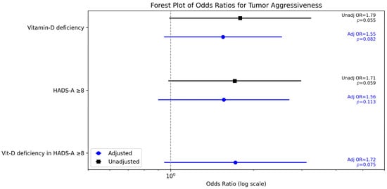 The effect of vitamin D deficiency on tumor aggressiveness was examined across distress levels. In patients with high anxiety (HADS-A ≥ 8), vitamin D deficiency was associated with an adjusted OR of 1.72 (95% CI 0.85–3.49, p = 0.075) for G3 tumors, compared to an OR of 1.44 (95% CI 0.51–2.87, p = 0.061) in those with low anxiety (HADS-A < 8, n = 54). The p-value did not reach statistical significance, although a weak trend can be observed.