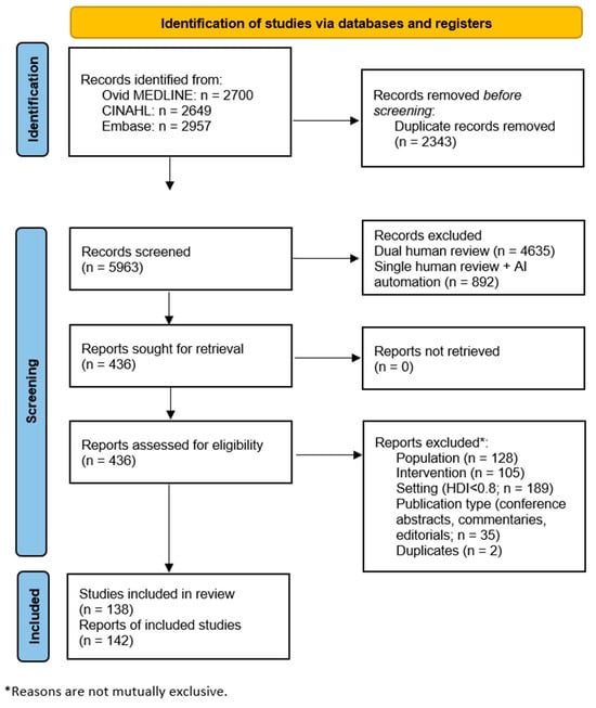 Searches resulted in 8306 references (Ovid MEDLINE: 2700 references; CINAHL: 2649 references; and Embase: 2957 references). The PRISMA flow diagram for screening and selection is presented in Figure 1. After deduplication, the initial sample totaled 5963 references for dual screening of title and abstract. In the full-text screening phase, 436 references were screened. A total of 142 references met study inclusion/exclusion criteria after the full-text screening [19,20,21,22,23,24,25,26,27,28,29,30,31,32,33,34,35,36,37,38,39,40,41,42,43,44,45,46,47,48,49,50,51,52,53,54,55,56,57,58,59,60,61,62,63,64,65,66,67,68,69,70,71,72,73,74,75,76,77,78,79,80,81,82,83,84,85,86,87,88,89,90,91,92,93,94,95,96,97,98,99,100,101,102,103,104,105,106,107,108,109,110,111,112,113,114,115,116,117,118,119,120,121,122,123,124,125,126,127,128,129,130,131,132,133,134,135,136,137,138,139,140,141,142,143,144,145,146,147,148,149,150,151,152,153,154,155,156,157,158,159,160].