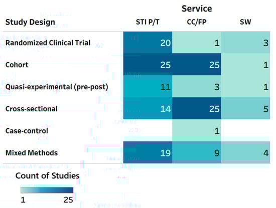 Heat map: service type by study design. CC/FP—contraceptive care or family planning; STI P/T—sexually transmitted infection prevention and treatment; SW—sexual well-being. Note: Multiple service types could have been tested in a given study/publication, so total counts may not add up to the total number of reports included in this scoping review (n = 142 publications).