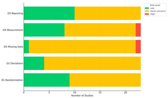 Bar graph for domain-specific risk of bias assessments. Abbreviation: D—domain; D1—bias from the randomization process; D2—bias from deviations from intended interventions; D3—bias from missing outcome data; D4—bias in the measurement of the outcome; D5—bias in the selection of the reported result.
