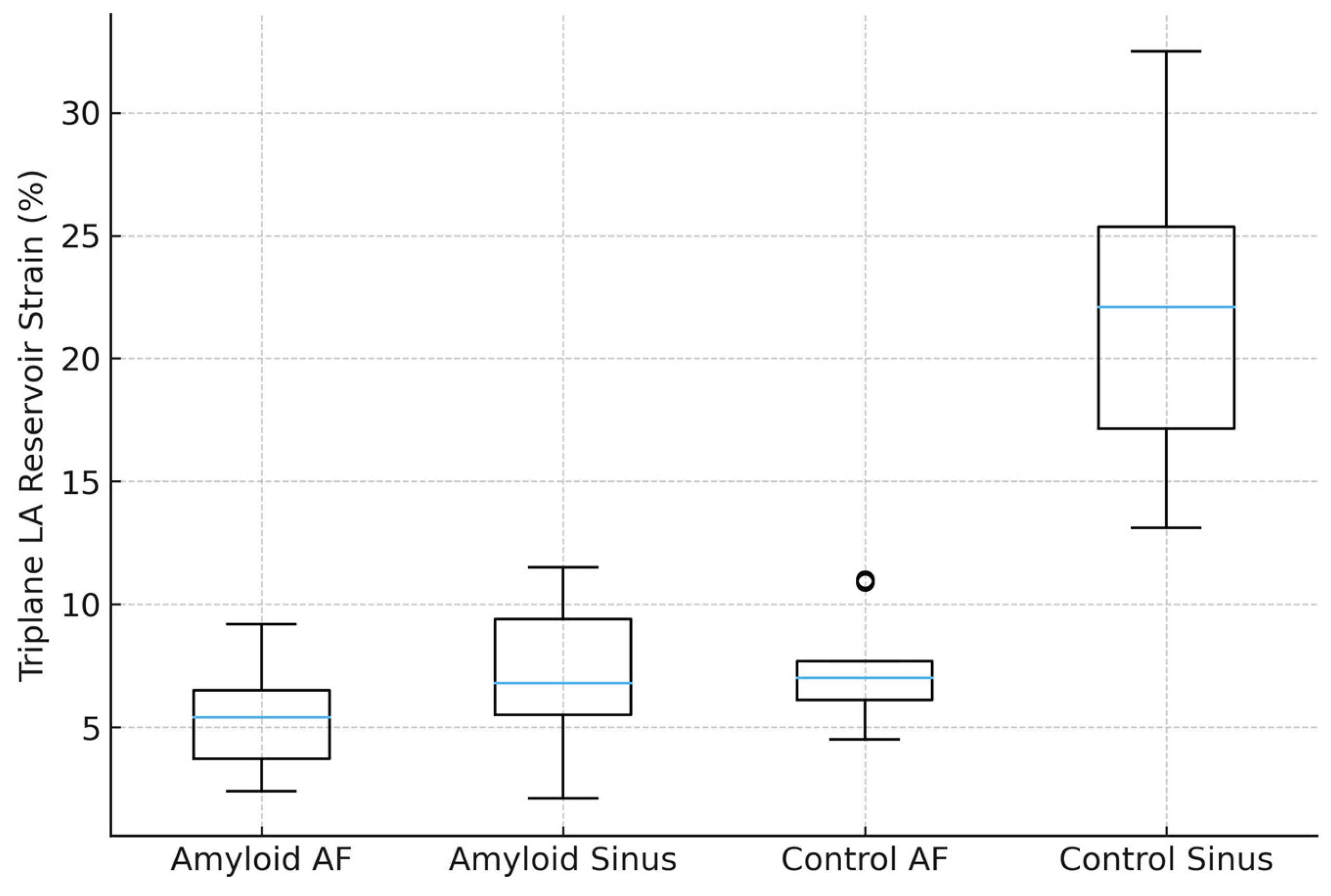 Distribution of triplane left atrial (LA) reservoir strain among study groups. Boxplot illustrating triplane LA reservoir strain in patients with cardiac amyloidosis and in controls, stratified by cardiac rhythm during echocardiographic examination (sinus rhythm vs. atrial fibrillation). LA strain was lowest in amyloidosis patients with atrial fibrillation and highest in controls with sinus rhythm, demonstrating a graded reduction across the four groups (Amyloidosis AF < Amyloidosis Sinus < Control AF < Control Sinus). Boxes indicate interquartile range, horizontal lines the median, and whiskers the 5–95th percentiles, and circles denote outliers.