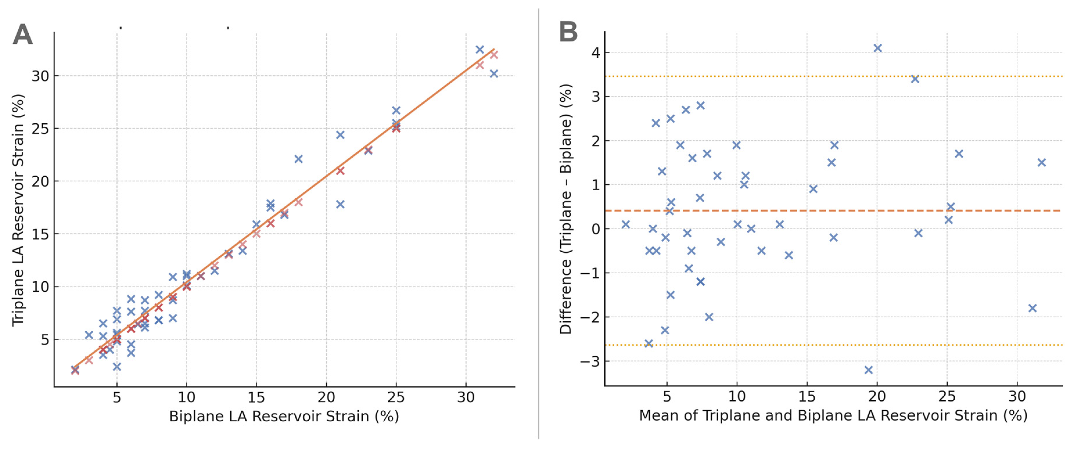 Agreement between triplane and biplane LA reservoir strain. (A) Scatterplot showing the relationship between triplane LA reservoir strain and biplane LA reservoir strain in all participants. The orange regression line illustrates the close correlation between the two methods (r = 0.94, p < 0.0001). (B) Bland–Altman plot showing the difference between triplane and biplane LA reservoir strain. The mean bias (red dashed line) represents the average difference (Triplane − Biplane), and the dotted orange lines denote the 95% limits of agreement. Most differences cluster near zero, indicating good agreement and minimal systematic bias.